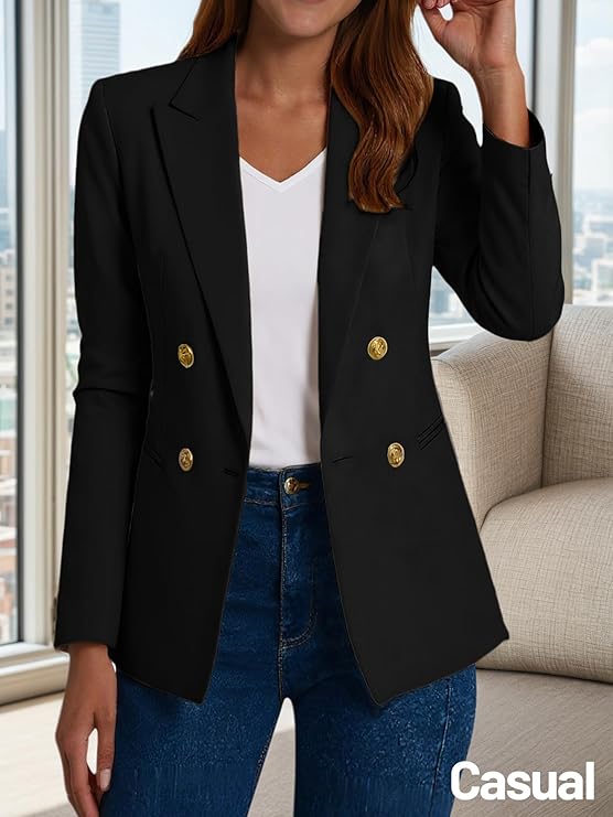 Double-Breasted Black Blazer Made from a wrinkle-resistant polyester blend, this blazer features gold-tone buttons, structured shoulders, and a tailored waist. It’s a statement of quiet authority.